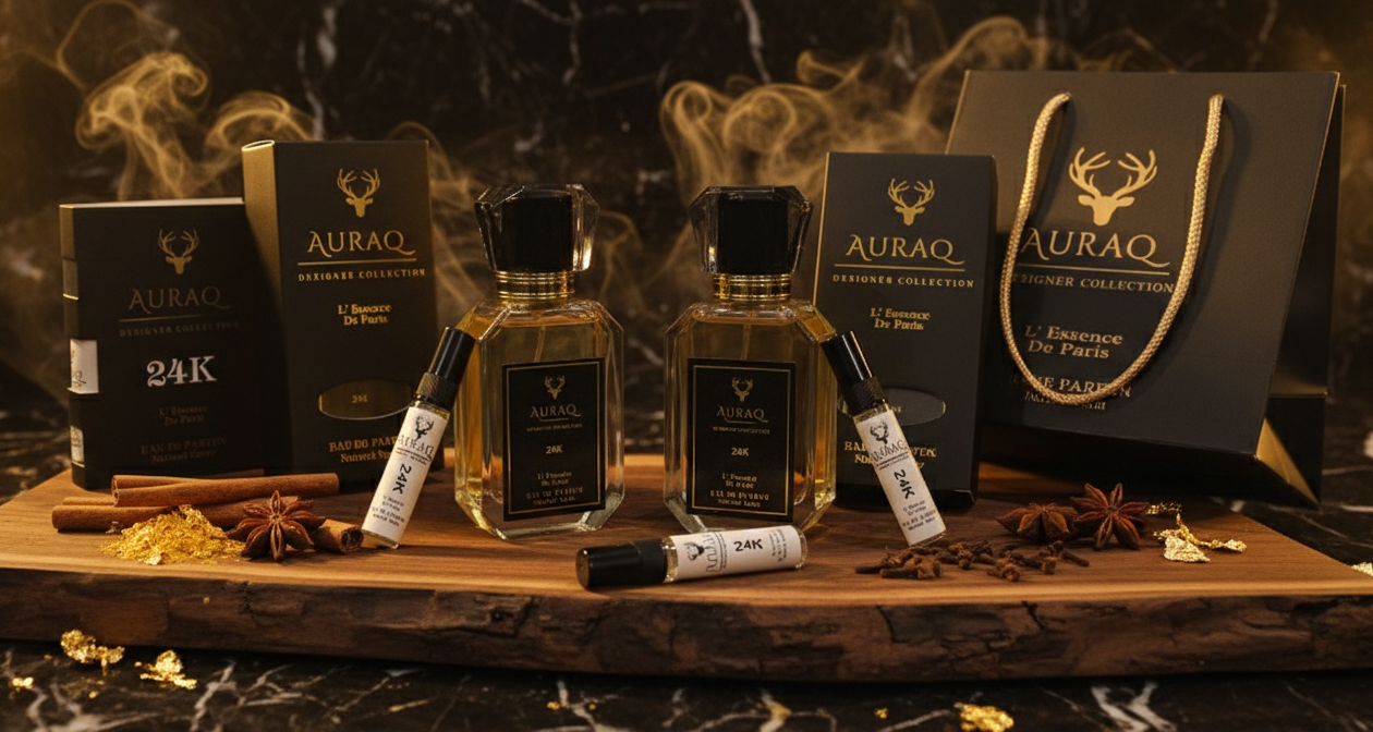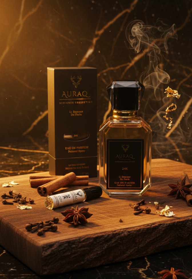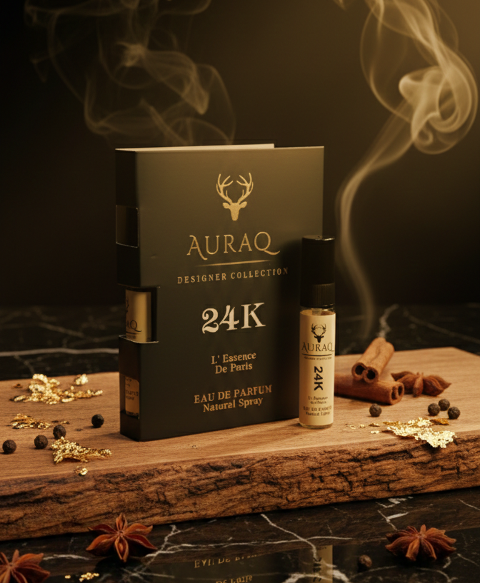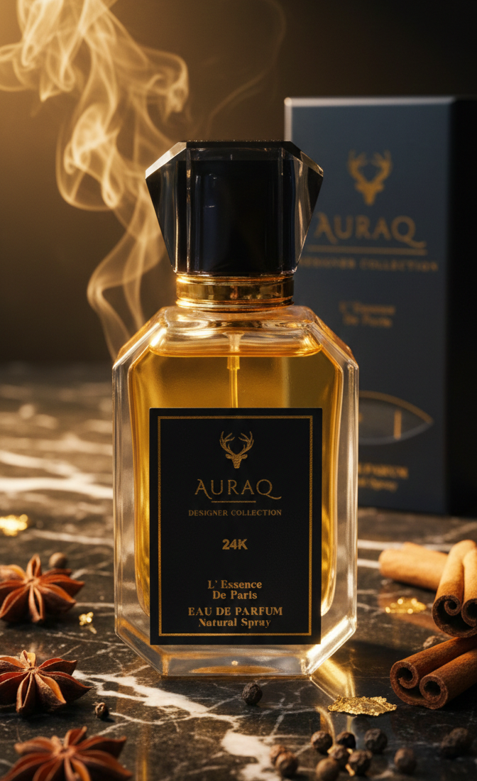 Discover Auraq 24K. A luxury Eau de Parfum inspired by the brilliance of gold. Featuring Citrus, Amber, and Vanilla, 24K is a warm, opulent fragrance with bold longevity. Part of the Auraq Designer Collection: L’ Essence de Paris.