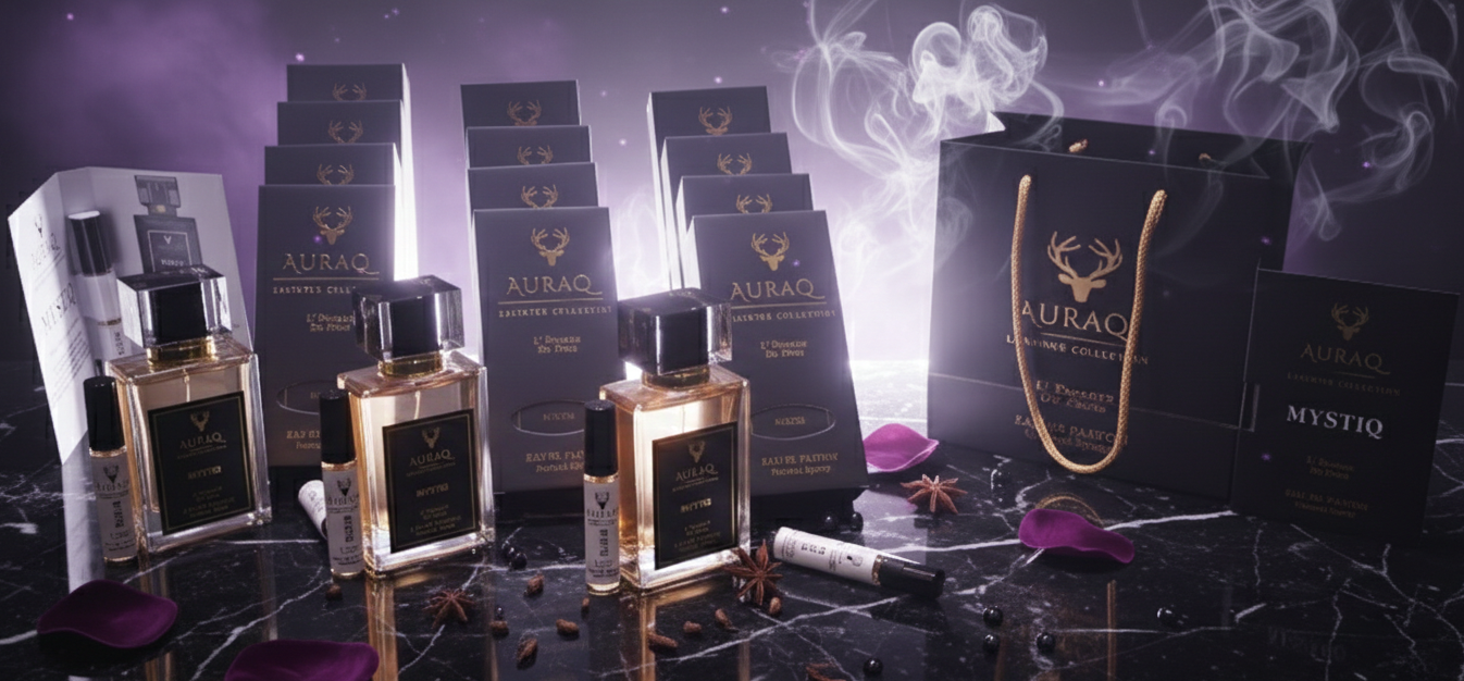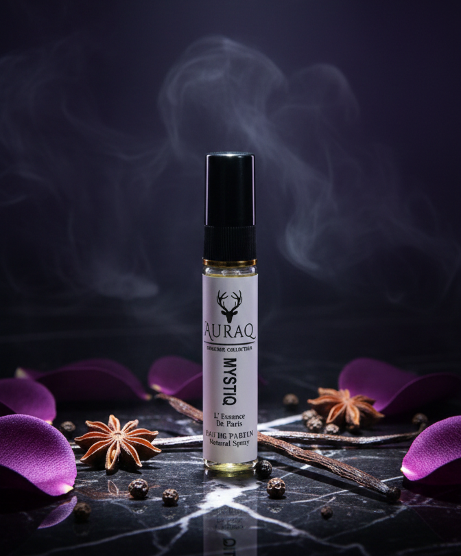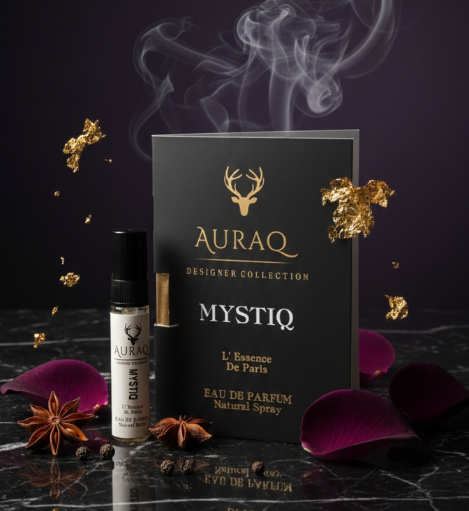 Unlock the mystery of Auraq Mystiq. A dark, sensual Eau de Parfum with Mandarin, Jasmine, and Amber. Experience an addictive, seductive scent that leaves an unforgettable impression. Part of the Auraq Designer Collection: L’ Essence de Paris.